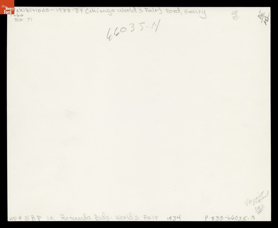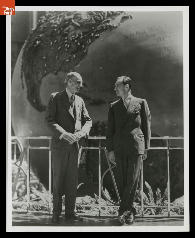 After the Century of Progress Exposition ended in 1934, Ford Motor Company brought its central Rotunda building from that fair back to Dearborn. From 1936 to 1962, Ford recreated the excitement of a World's Fair exposition on its home turf. This photo depicts Henry and Edsel Ford at the Ford Rotunda on its opening day, May 16, 1936.