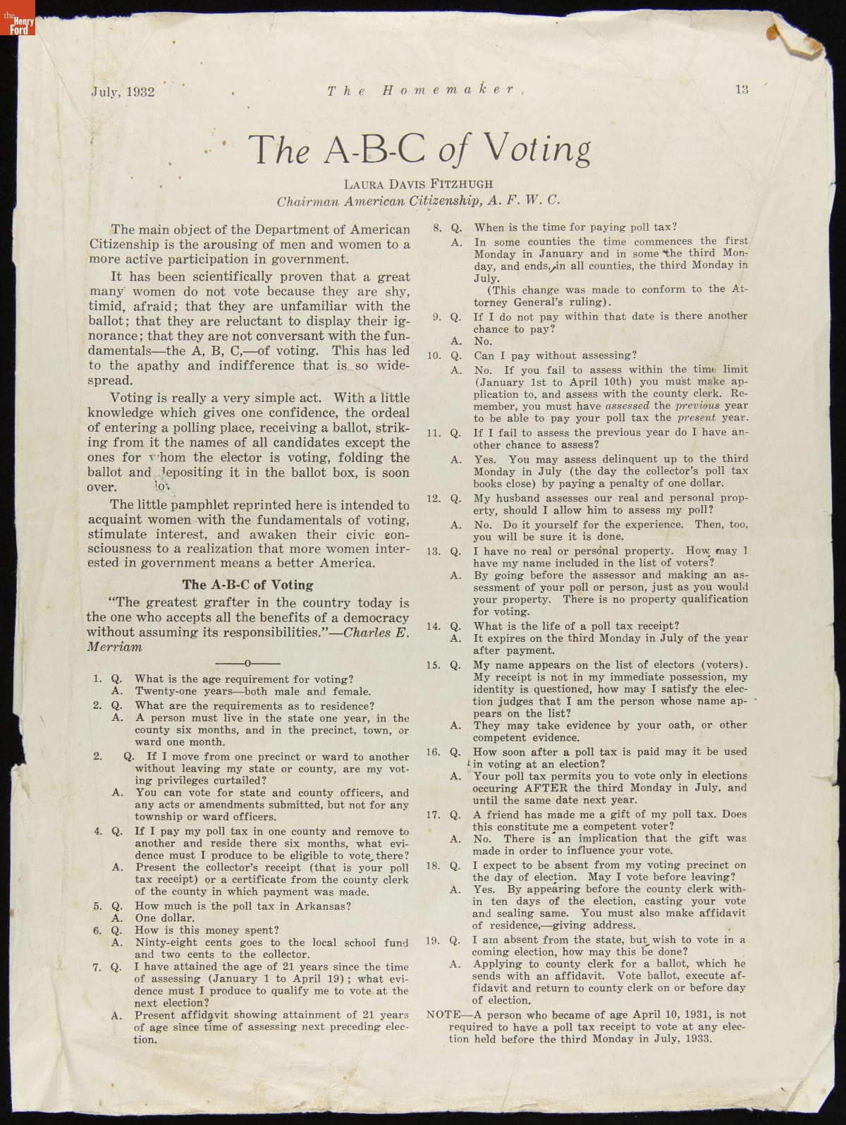 Arkansas ratified the 19th Amendment -- granting women the right to vote -- in 1919. More than a decade later, the Arkansas Federation of Women's Clubs -- hoping to increase voter participation -- published a pamphlet (reprinted in The Homemaker magazine) that provided women in Arkansas with the "fundamentals of voting." It explained who could vote and how to navigate the state's residency and poll tax requirements.