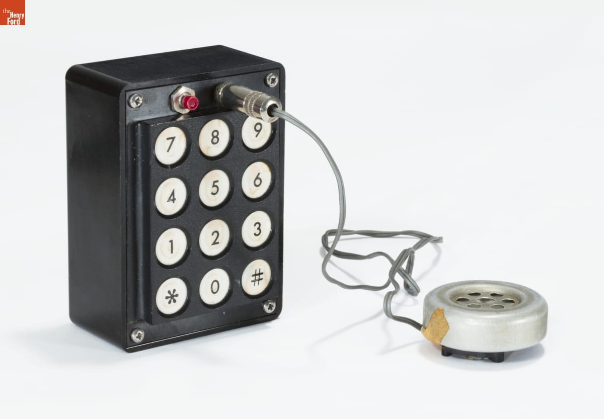 Blue boxes allowed people to make free, illegal, long-distance phone calls. They mimicked the same 2600hz "switching" tone used by telephone operators to connect people, tricking automated systems. In the 1960s, notorious "phone phreakers" infiltrated the telephone network; their actions were comparable to modern-day hackers. Built by Steve Wozniak, this box predates Apple Computer Inc. by four years.