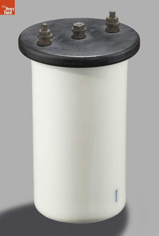 A chemical reaction hidden within this battery's white porcelain jar creates electricity. Thomas Edison developed this battery from an earlier design by Felix Lalande and Georges Chaperon. Batteries like this Type S powered fans, phonographs, telephones, and a variety of other devices for years in places where the electric grid did not reach, or electric generators were impractical.