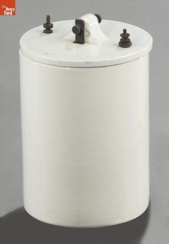 A chemical reaction hidden within this battery's white porcelain jar creates electricity. Thomas Edison developed this battery from an earlier design by Felix Lalande and Georges Chaperon. Batteries like this powered fans, phonographs, telephones, and a variety of other devices for years in places where the electric grid did not reach, or electric generators were impractical.