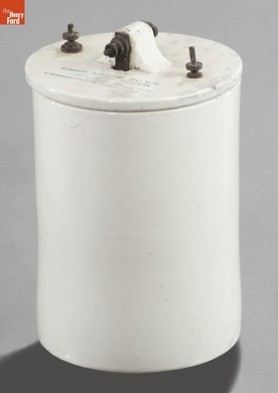A chemical reaction hidden within this battery's white porcelain jar creates electricity. Thomas Edison developed this battery from an earlier design by Felix Lalande and Georges Chaperon. Batteries like this powered fans, phonographs, telephones, and a variety of other devices for years in places where the electric grid did not reach, or electric generators were impractical.