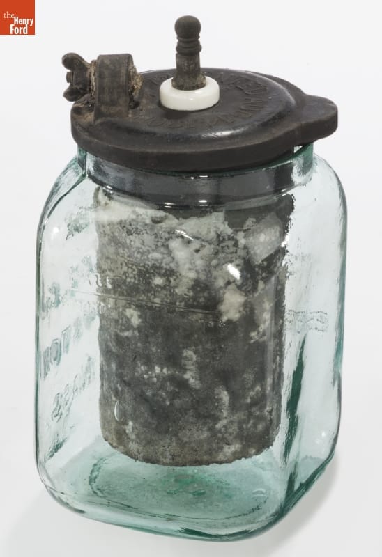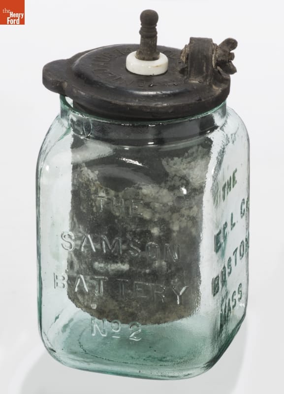 In the late 19th and early 20th centuries, people used batteries to power telegraph and telephone systems, ring bells and alarms, or spark gasoline engines. The Electric Gas Lighting Company in Boston Massachusetts made this wet cell battery called the Samson. Its glass jar held a conductive solution surrounding the carbon and zinc elements that produced an electrochemical reaction.