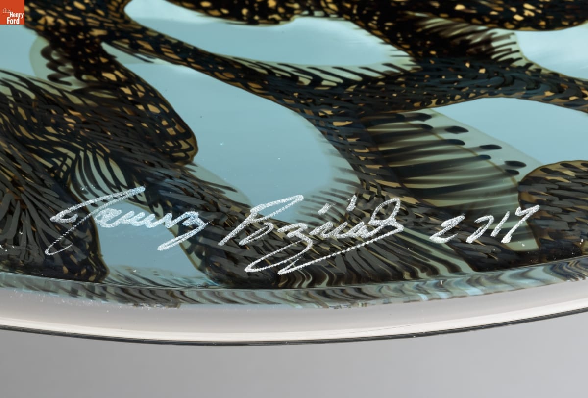 This platter is a new form for Janusz Pozniak, based on experimental pieces he first produced at a glass furnace in Istanbul, Turkey, in 2017 and developed in conversation with Josh Wojick, Greenfield Village master glassblower. The colorations in the platter are from bits of murrini glass sandwiched together and fused into shape.
