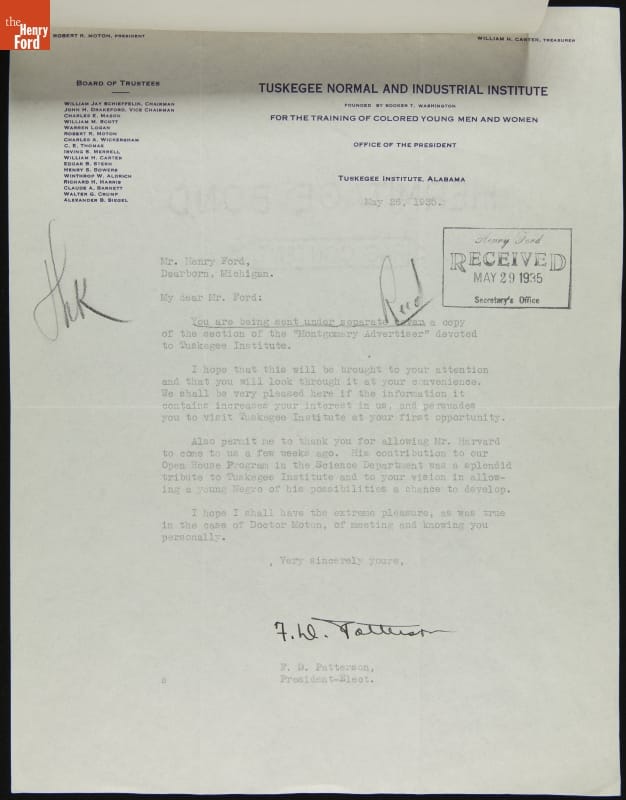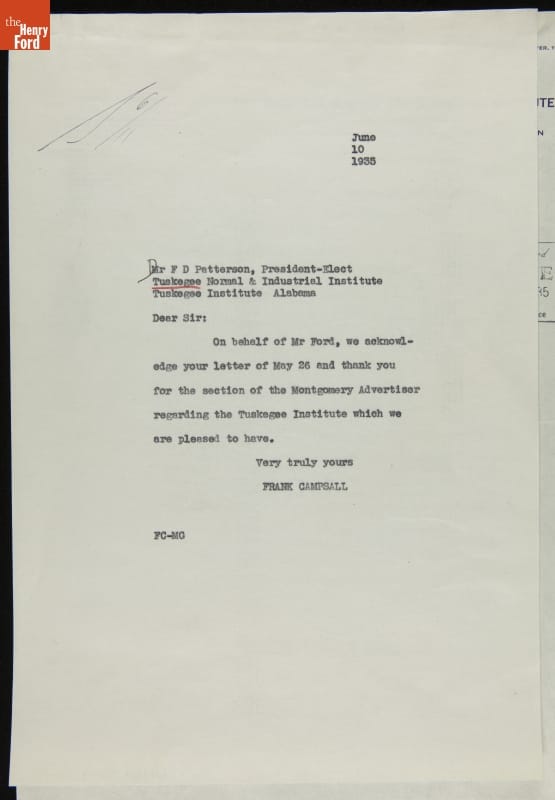 Correspondence between F. D. Patterson and Frank Campsall (for Henry Ford) regarding Claude Harvard's Visit to Tuskegee Institute, May-June 1935