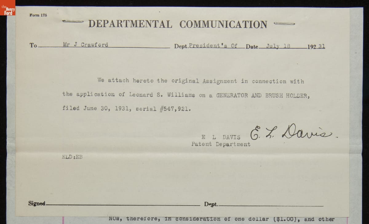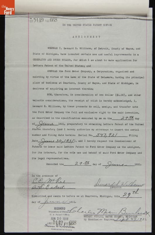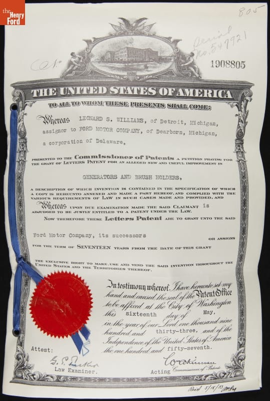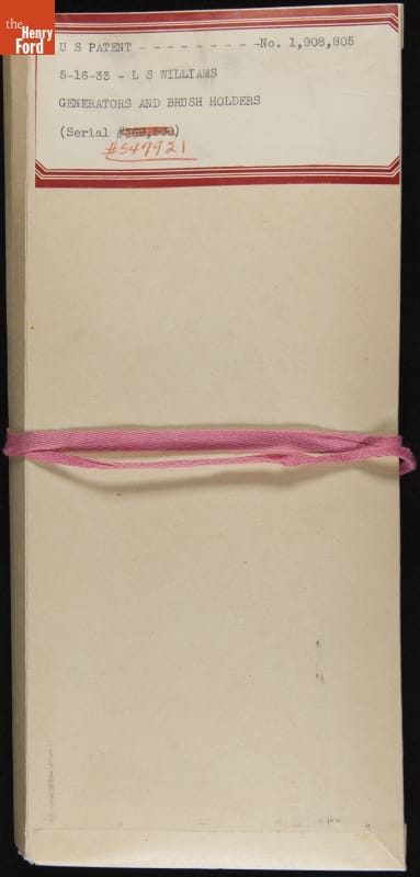 Patent for Generator and Brush Holder Improvement, Granted May 1933 to Leonard S. Williams and Assigned to Ford Motor Company