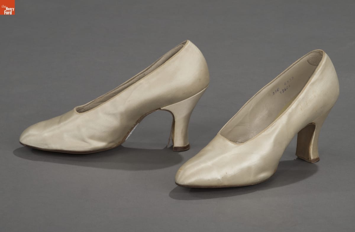 Dress, belt, hat, and veil were created by unknown manufacturers; the shoes were manufactured by Morton's Fashion Shoes.