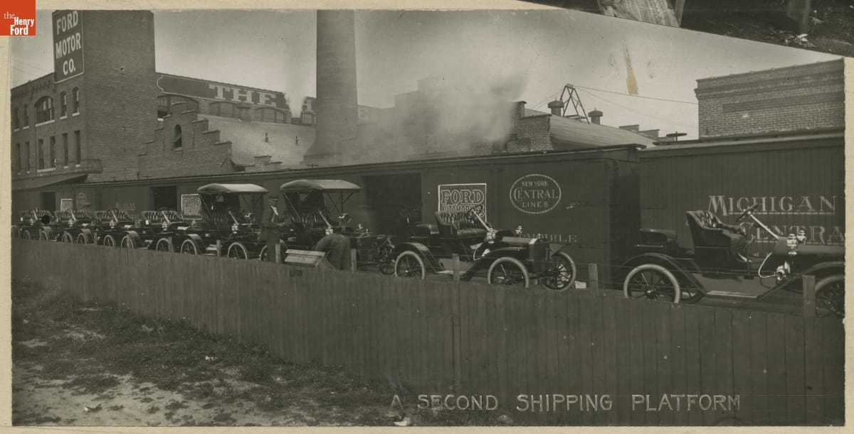 Ford Model S runabouts await loading onto boxcars at Ford Motor Company's Piquette Avenue Plant in Detroit. The boxcars belong to the Michigan Central Railroad, a subsidiary of the New York Central Railroad.