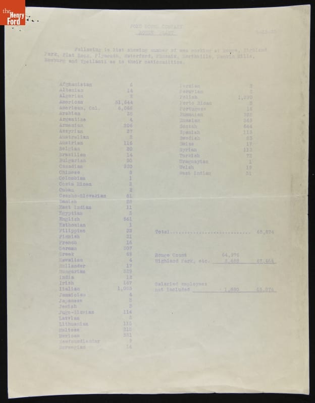 Employees of Ford Motor Company made up a diverse workforce drawn from around the world. This list, compiled in August 1935, shows more than 60 nations and territories represented by 66,000 hourly workers at various Ford plants in southeast Michigan.