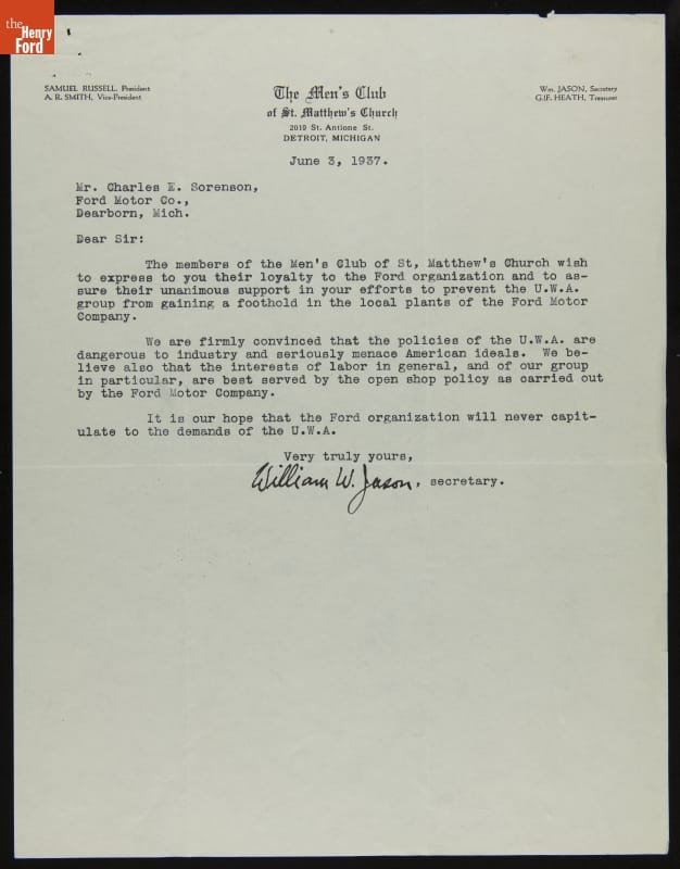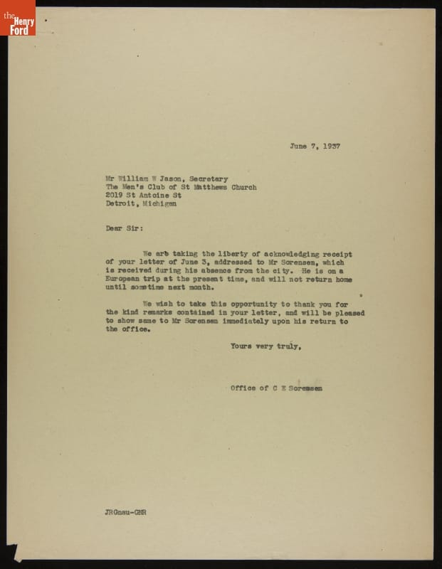 Correspondence between William W. Jason of The Men's Club of St. Matthew's Church and Charles E. Sorensen, June 1937