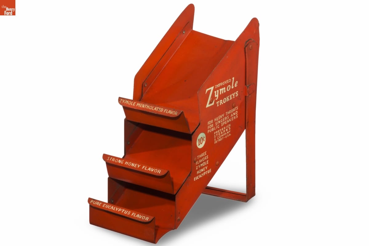 IMPROVED / Zymole / TROKEYS / FOR HUSKY THROATS / FOR SINGERS AND / PUBLIC SPEAKERS / FREDERICK / STEARNS / & COMPANY / DETROIT U.S.A. / 10(cents) / THREE / FLAVORS / ZYMOLE / HONEY / EUCALYPTUS