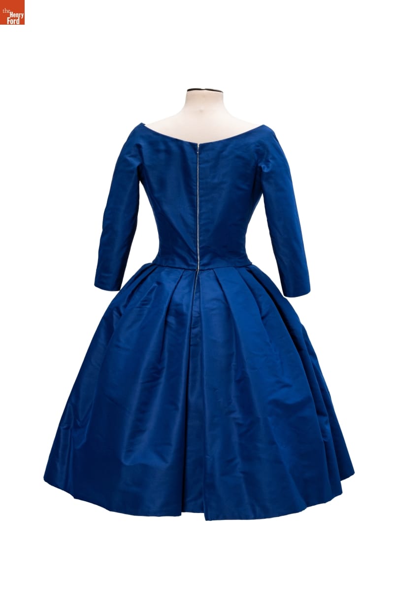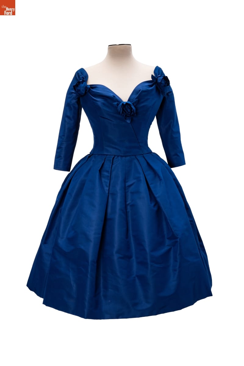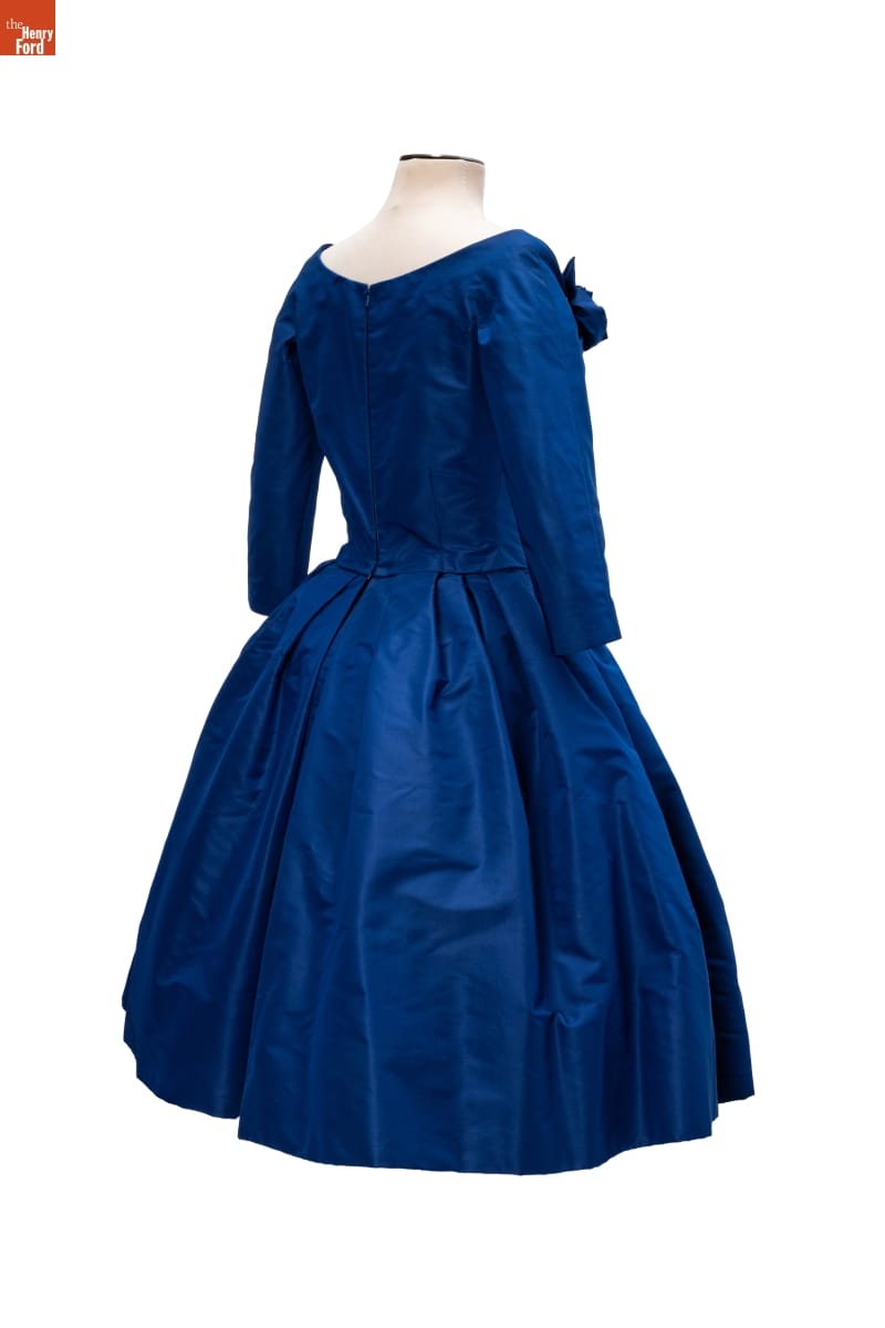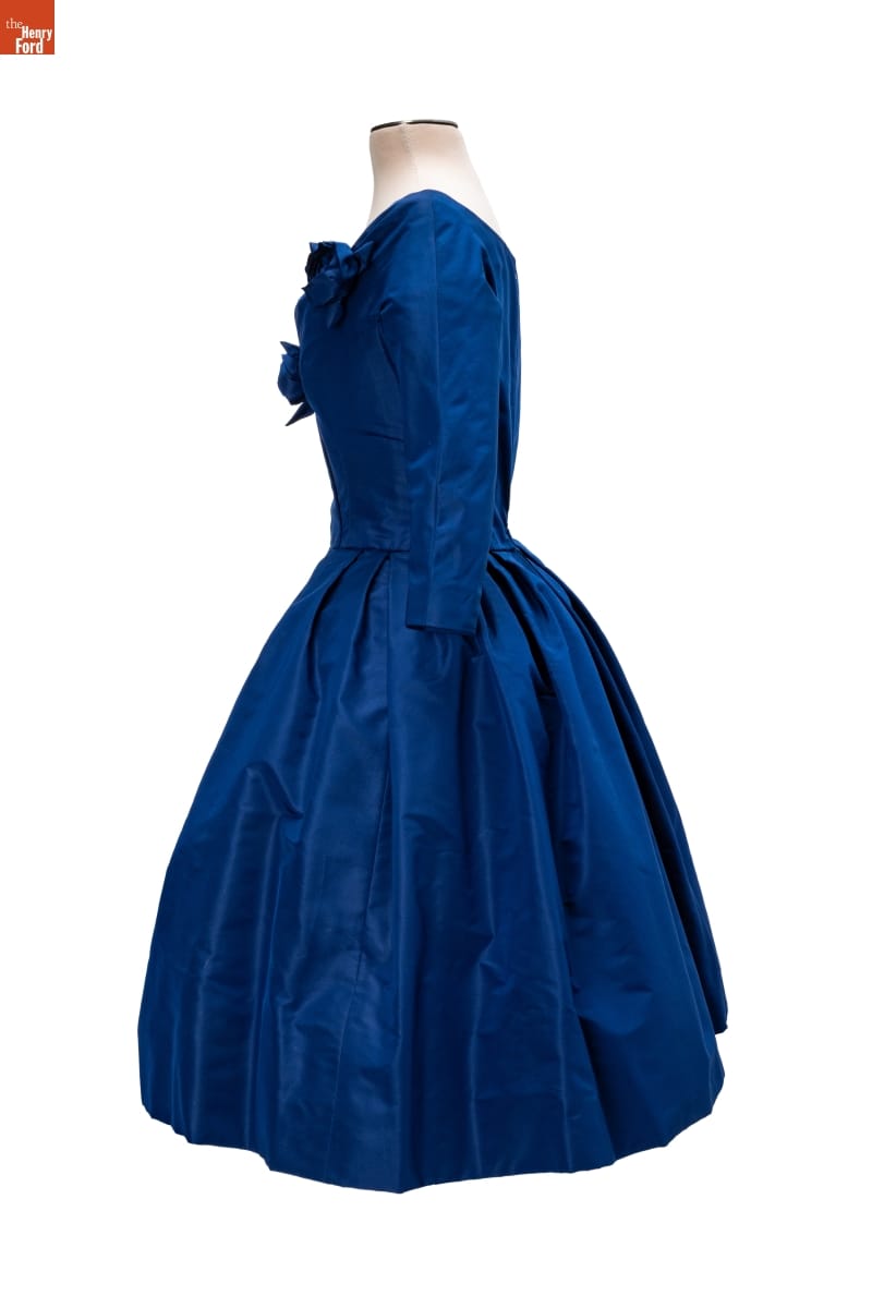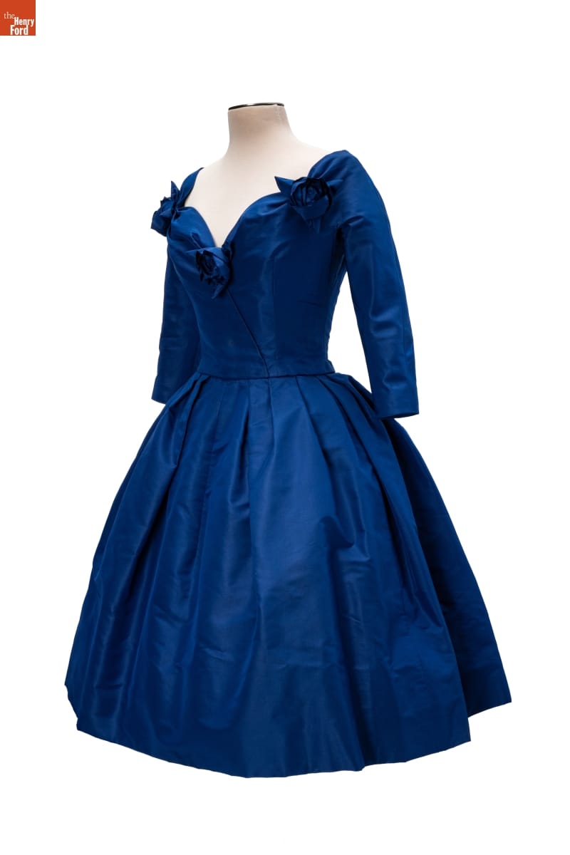 Elizabeth Parke Firestone, wife of tire magnate Harvey S. Firestone, Jr., cultivated a refined sense of fashion through years of interest in clothing design and collaboration with world-renowned couturiers. Paris designer Christian Dior created a design drawing of this dress in red--a favorite color choice in his clothing line. Firestone preferred blue.