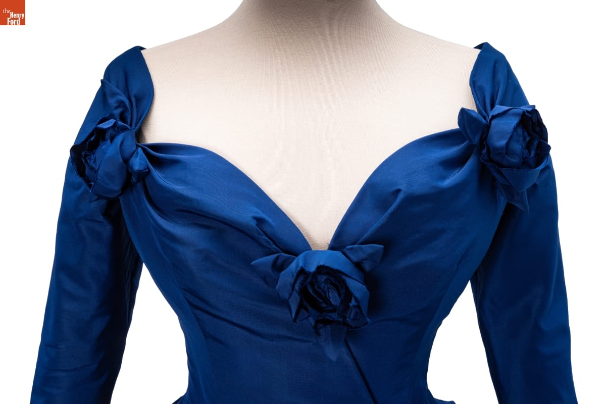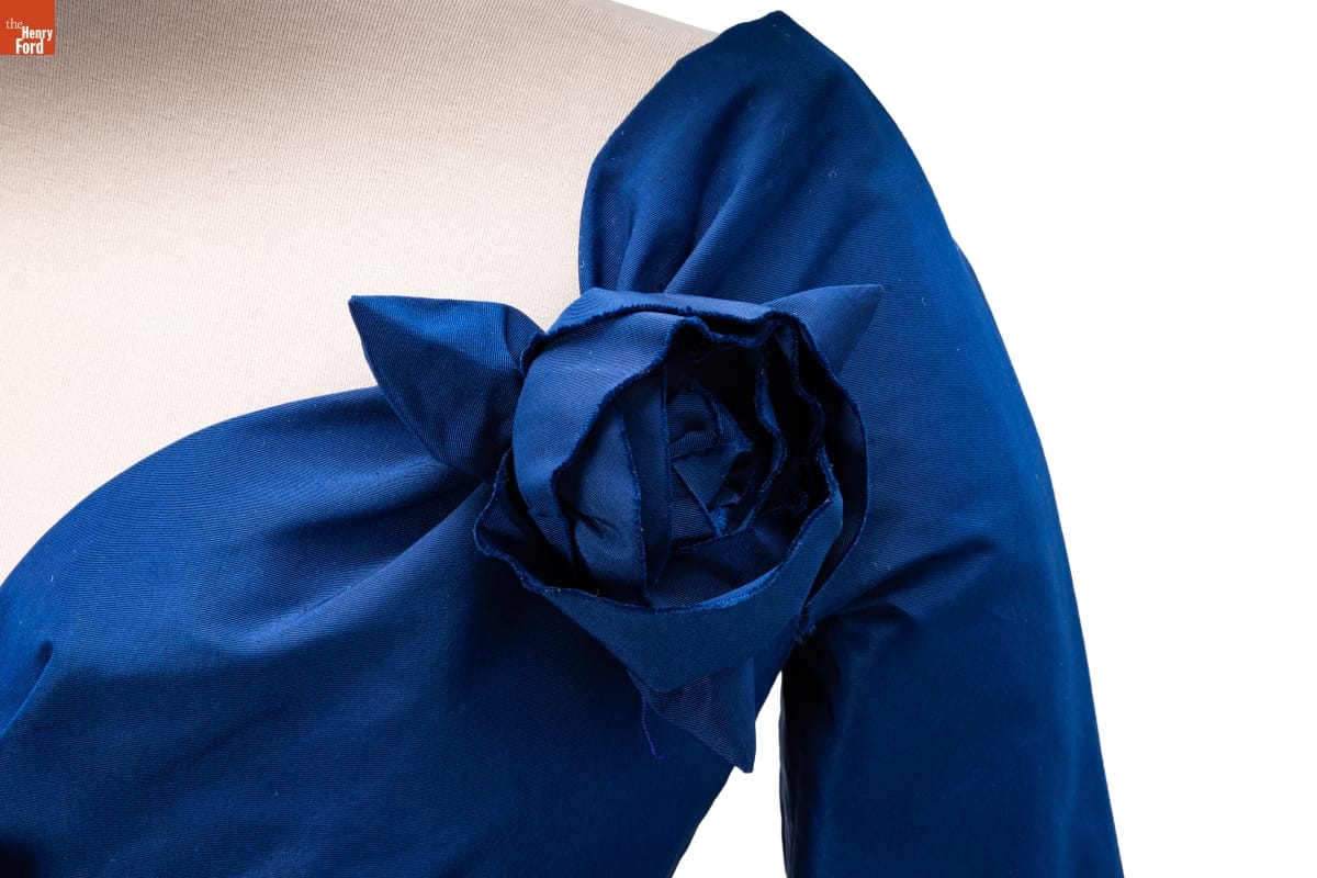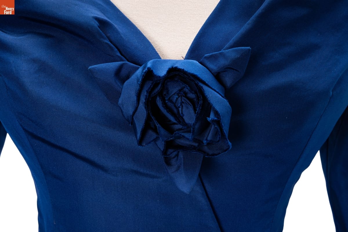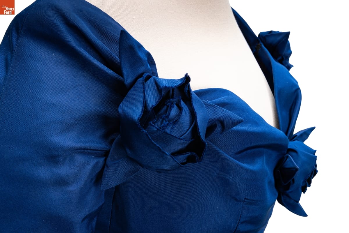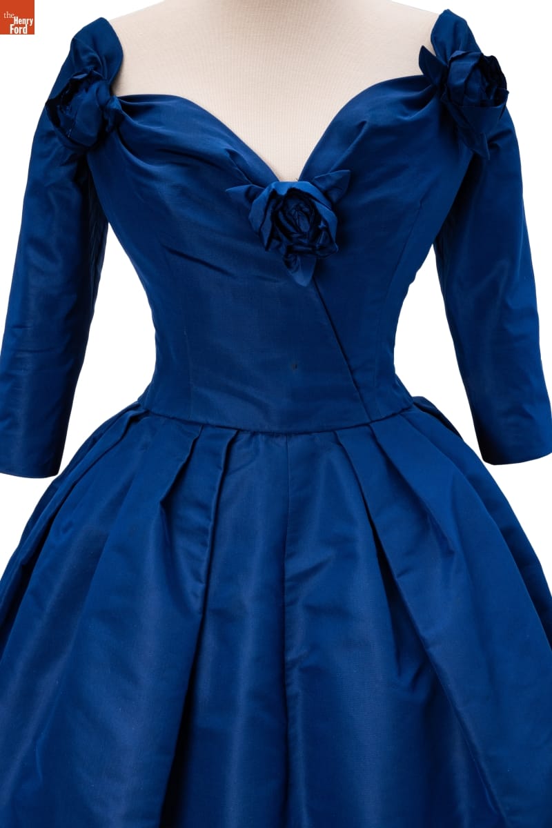 Elizabeth Parke Firestone, wife of tire magnate Harvey S. Firestone, Jr., cultivated a refined sense of fashion through years of interest in clothing design and collaboration with world-renowned couturiers. Paris designer Christian Dior created a design drawing of this dress in red--a favorite color choice in his clothing line. Firestone preferred blue.
