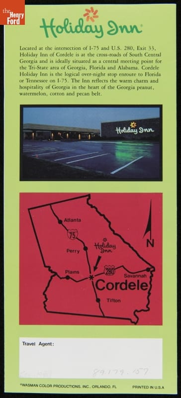 Consistent, quality service and amenities made the first Holiday Inns successful in the 1950s. Though the company evolved in the decades that followed, it retained many founding features. In the 1980s, this Holiday Inn sported a modernized corporate logo, but still offered the convenient location, free parking, and outdoor pool that were standard at the chain's first motels.