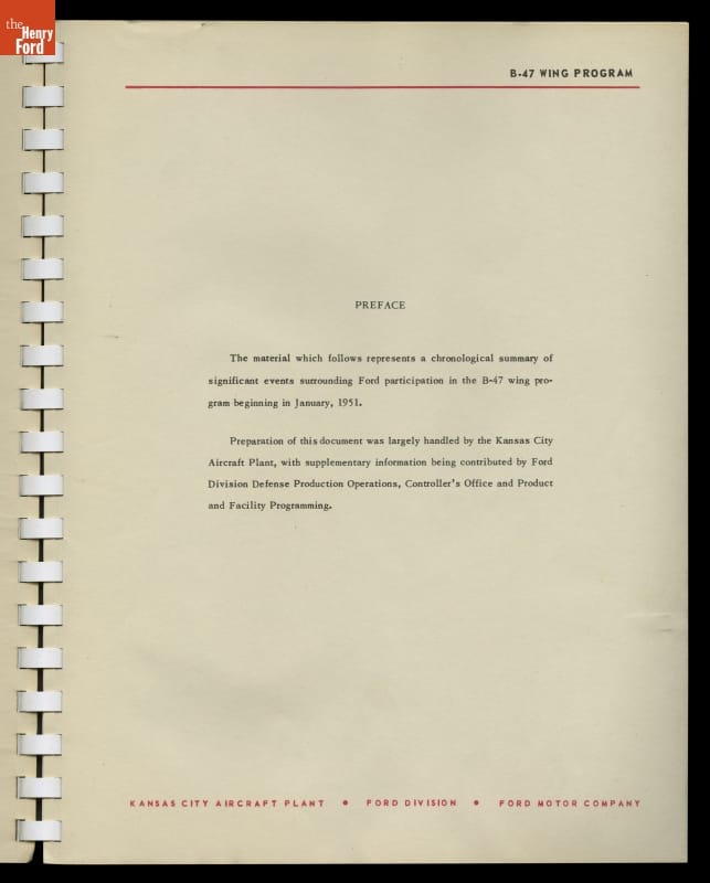 Report regarding Ford Motor Company Participation in B-47 Wing Program, January 1951 - December 1952