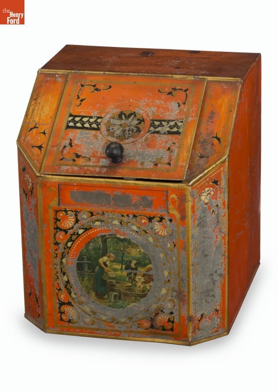 Before products like coffee, tea, and spices were individually packaged with company labels and logos grocers dispensed them from metal bins and canisters. These large tin containers were not only a convenient storage place that kept products dry, but their colorful painted, printed, and stenciled decorations provided an attractive display on the store's shelves and counters.