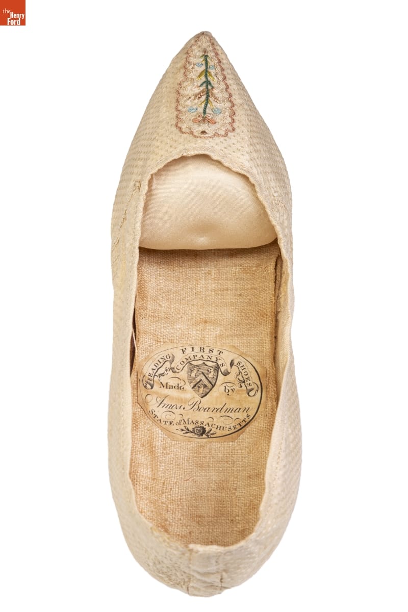 on printed paper label inside one shoe: FIRST / READING COMPANYS SHOES / Made by / Amos Boardman / STATE of MASSACHUSETTS