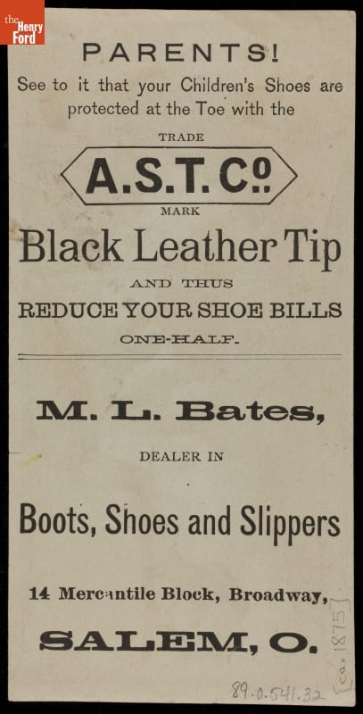 Advertised product manufactured by American Shoe Tip Co., Boston, Massachusetts, sold by M. L. Bates, Salem, Ohio. Card printed by Donaldson Brothers, Five Points, New York.