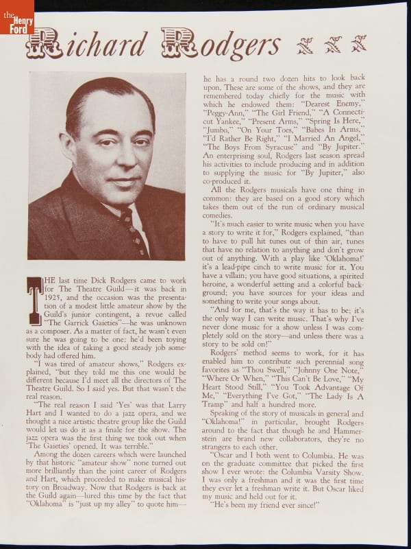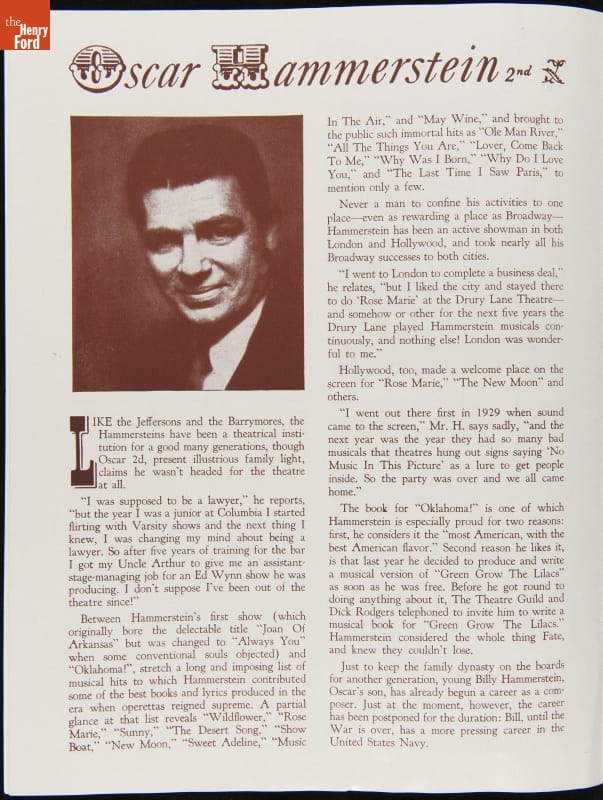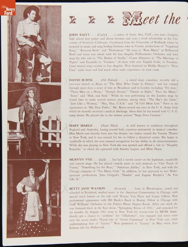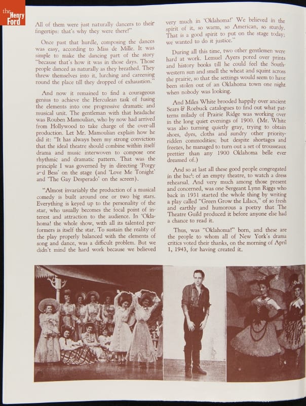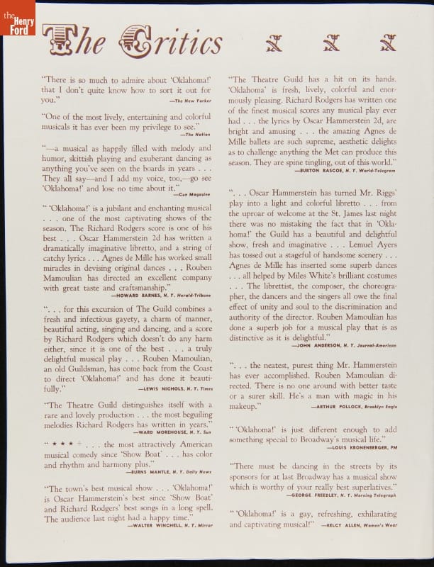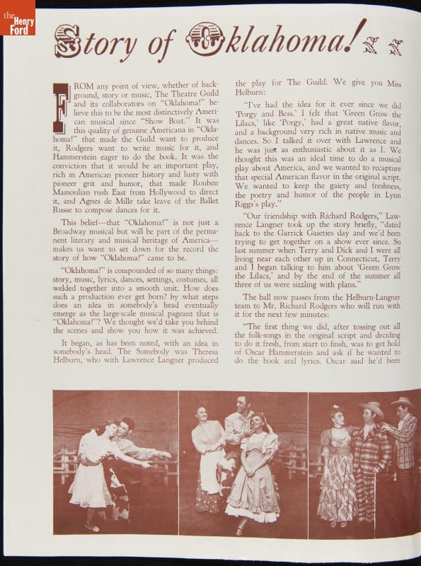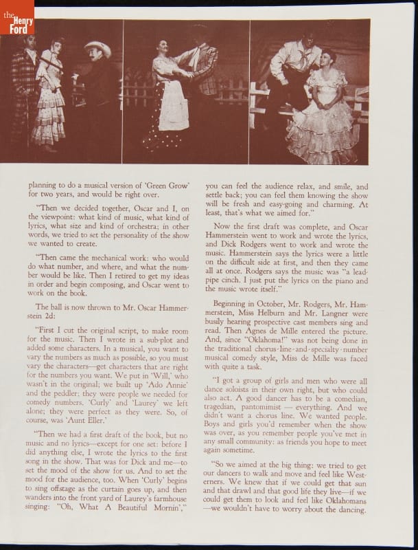 Oh, what a beautiful morning! Rodgers and Hammerstein's Oklahoma! opened on Broadway in 1943. This first collaboration from the now-famous musical duo interwove music, lyrics, dance -- and yes -- ballet to advance a dramatic storyline about love and life among ranchers and farmers in the American heartland. Audiences and critics raved. American musical theater would never be the same.