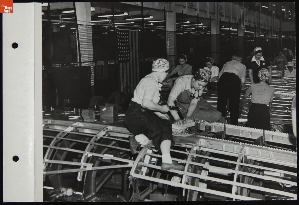 Women represented approximately one-third of the workers at Ford Motor Company's Willow Run plant, where they did everything from clerical work in the offices to riveting and welding on the assembly line. During World War II, women joined the workforce in record numbers to take on essential jobs traditionally held by men who had joined the armed forces.