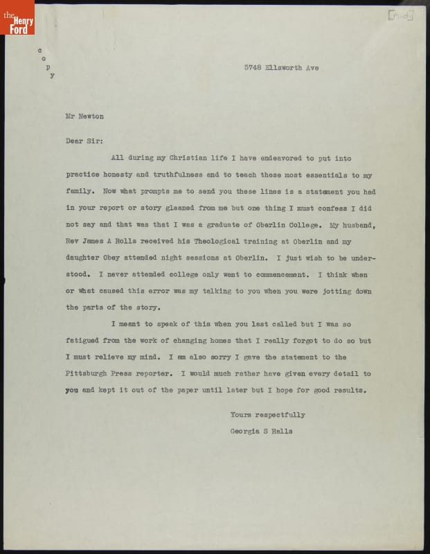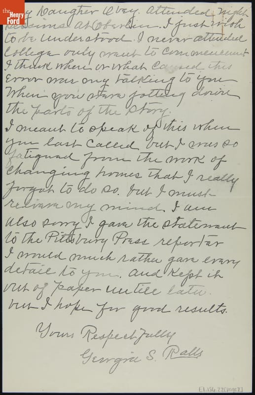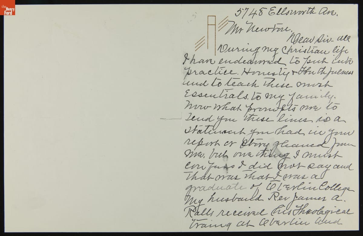 Letter from Georgia Singleton Ralls to Charles T. Newton in the Office of Henry Ford, circa 1935