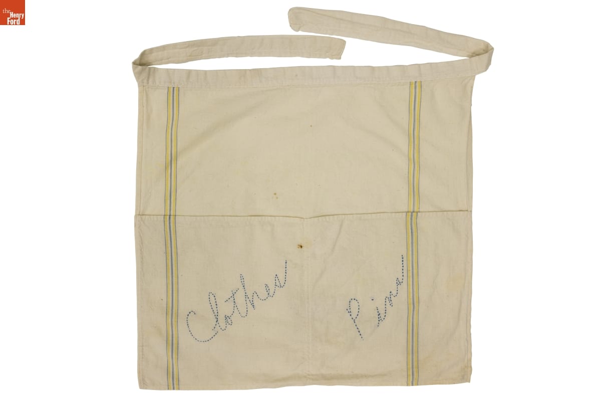 Before automatic clothes dryers came on the market after World War II, homemakers hung their wet laundry to dry on clotheslines stretched across basements or backyards. This practical apron -- made from kitchen toweling and sporting the embroidered words, "Clothes Pins" -- held clothespins for those without a clothes dryer or who preferred the clean scent of wash hung in the sun to dry.