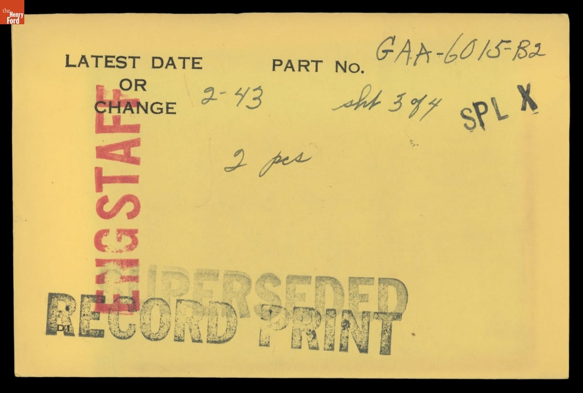 The Ford Motor Company created over a million parts drawings from 1903 to 1957. Many of these drawings specify engineering requirements for the components of Ford-made vehicles--including automobiles, trucks, tractors, military vehicles and Tri-motor airplanes. Others document assembly components, stages of casting and forging, or experimental designs. Beginning in the 1940s, Ford transferred the drawings to microfilm.
