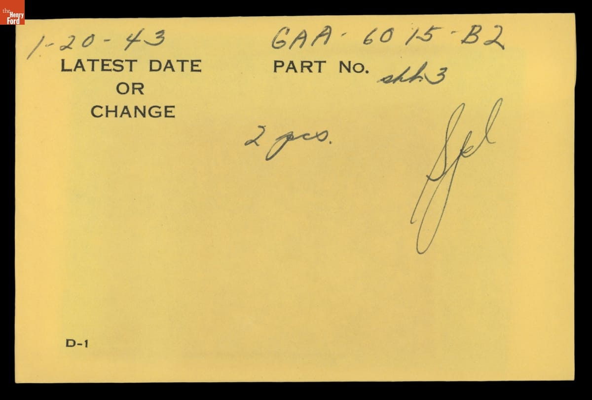 The Ford Motor Company created over a million parts drawings from 1903 to 1957. Many of these drawings specify engineering requirements for the components of Ford-made vehicles--including automobiles, trucks, tractors, military vehicles and Tri-motor airplanes. Others document assembly components, stages of casting and forging, or experimental designs. Beginning in the 1940s, Ford transferred the drawings to microfilm.