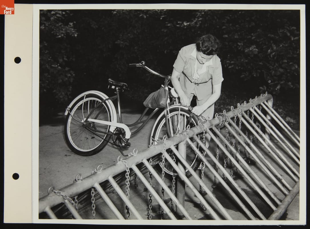 Rose Brochu made headlines in 1943 by riding a bicycle to her job at Ford Motor Company's Administration Building in Dearborn, Michigan. It was preferable to commuting by bus, said Brochu, because "I get here faster this way." She could also take advantage of the special bicycle parking area near the building.