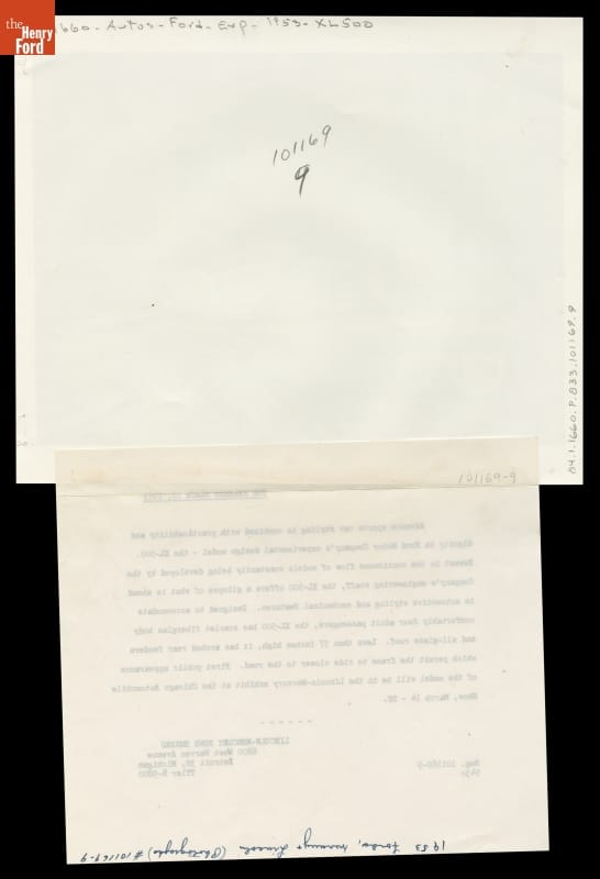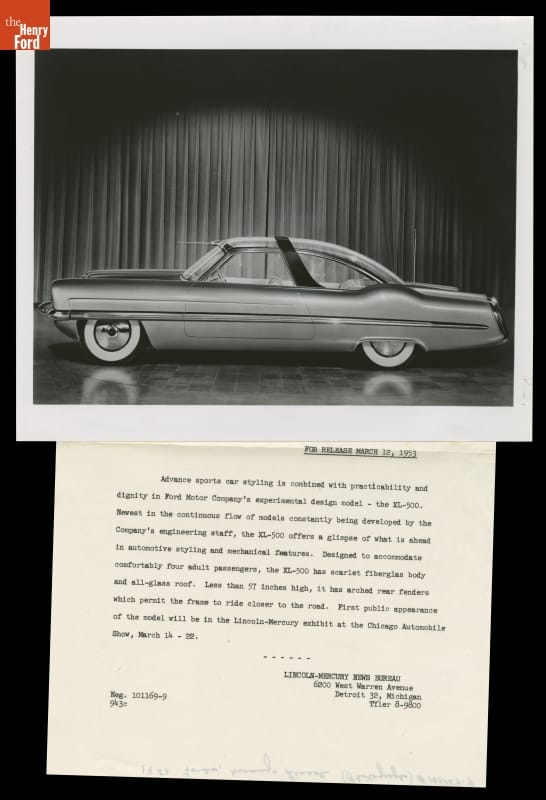 Ford Motor Company's Lincoln-Mercury Division revealed its Lincoln XL-500 concept car in 1953, to celebrate Ford's 50th anniversary. Promotional material heralded the car's power steering, power brakes, and push-button automatic transmission. In truth, the XL-500 was a non-running show piece. Even the "doors" were just grooves in the fiberglass body. But the XL-500's hooded headlights influenced Lincoln's 1956 production models.