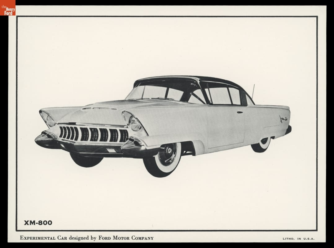 The Mercury XM-800 concept car debuted on the auto show circuit in 1954. The sleek hardtop was distinguished by its low height of 55.6 inches, its hooded headlights, and its exhaust ports integrated into the rear bumper. While the XM-800 never made it into production, some of its design cues appeared on Lincoln's 1956 production models.