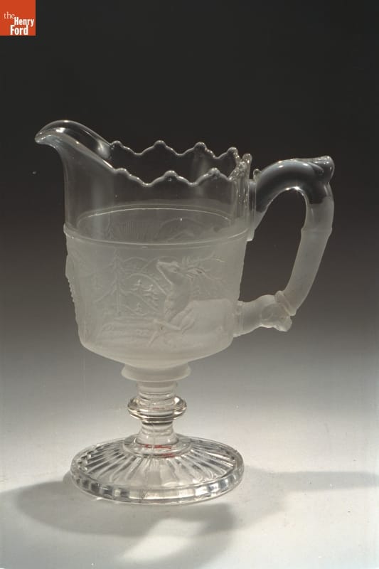 Middle-class Americans in the late 19th century arrayed their dining tables with affordable pressed-glass tableware. These items, usually sold in sets, came in a wide variety of patterns, colors, and styles. These decorative pieces -- like this cream pitcher -- communicated a family's status and taste to visitors and guests.