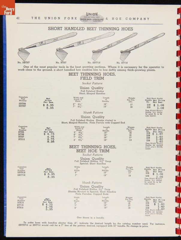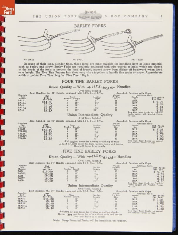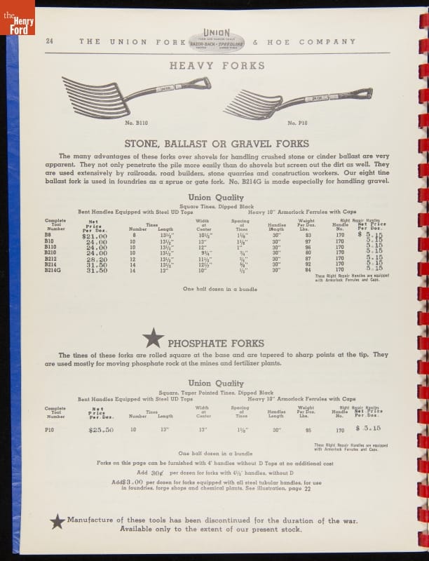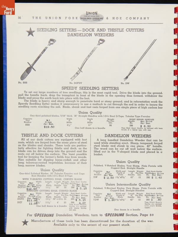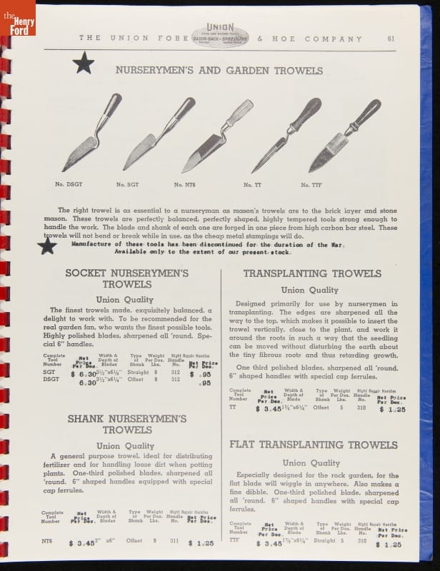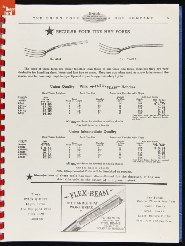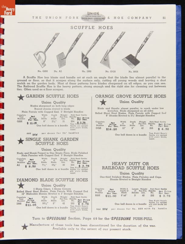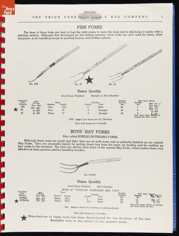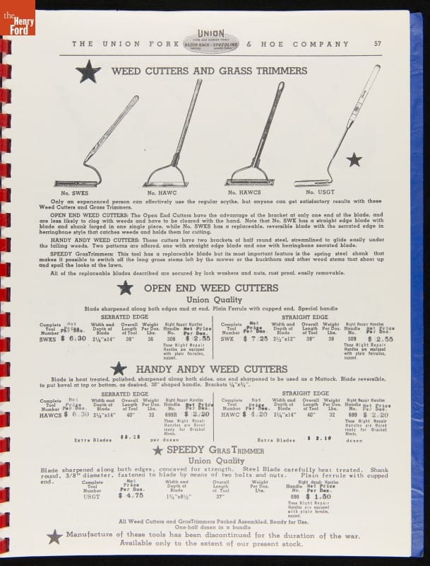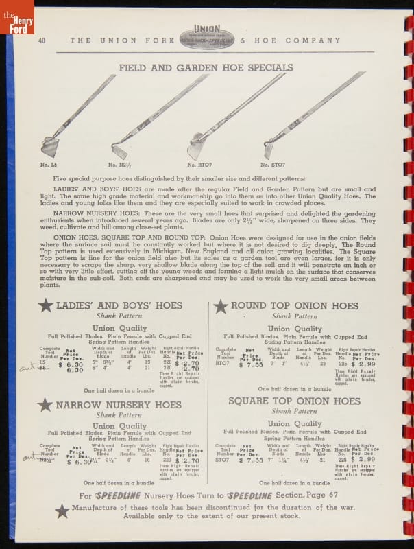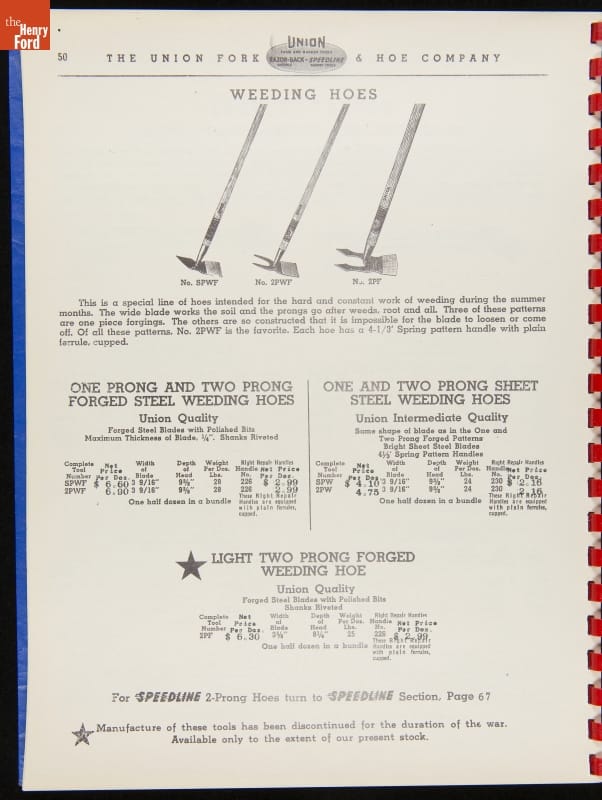 THF287911 / Union Fork & Hoe Company Catalog and Price List No. 142, August 1, 1942 / inside back cover