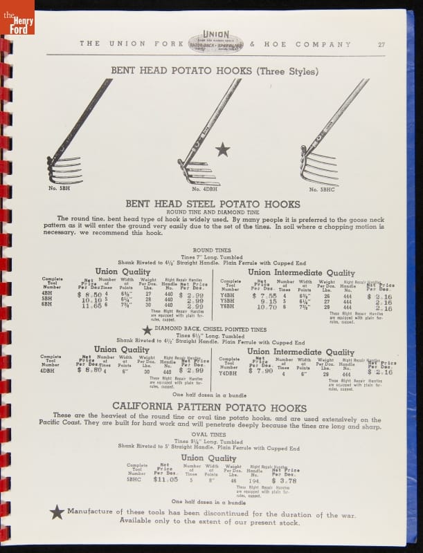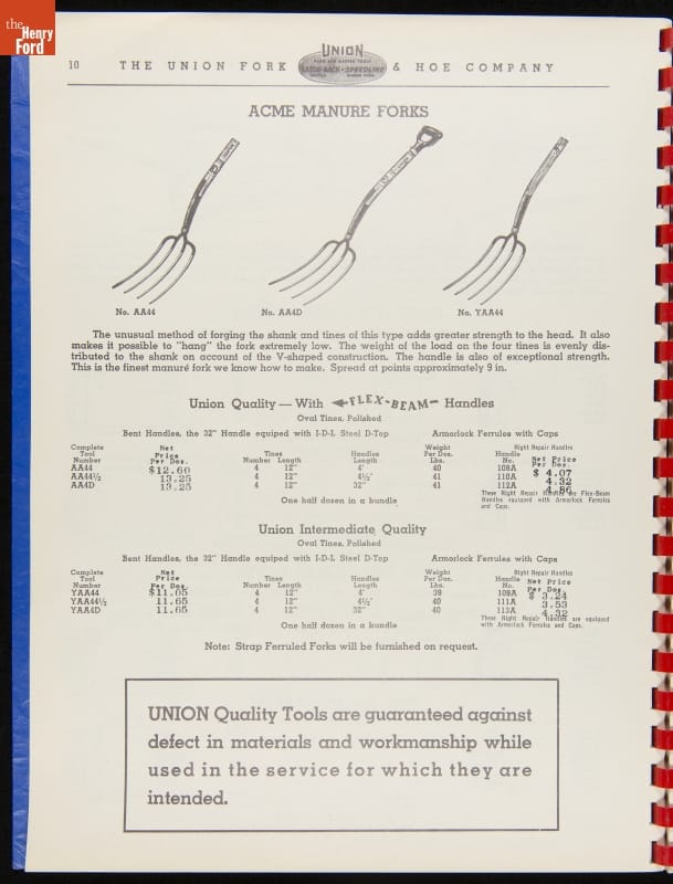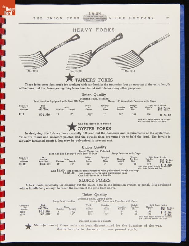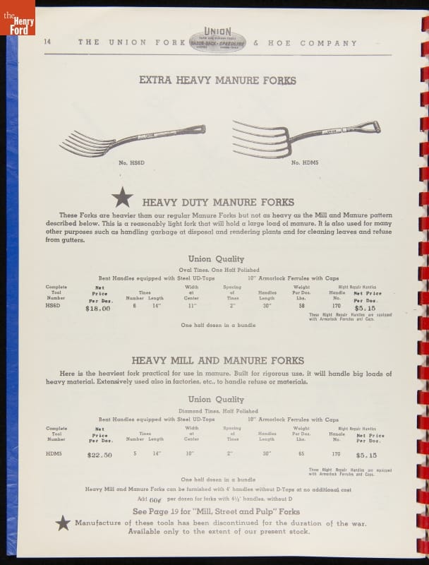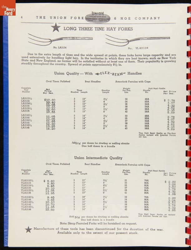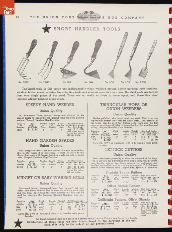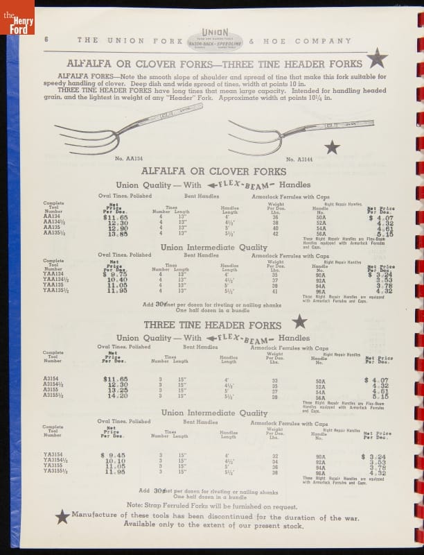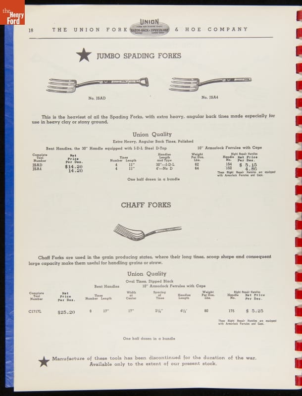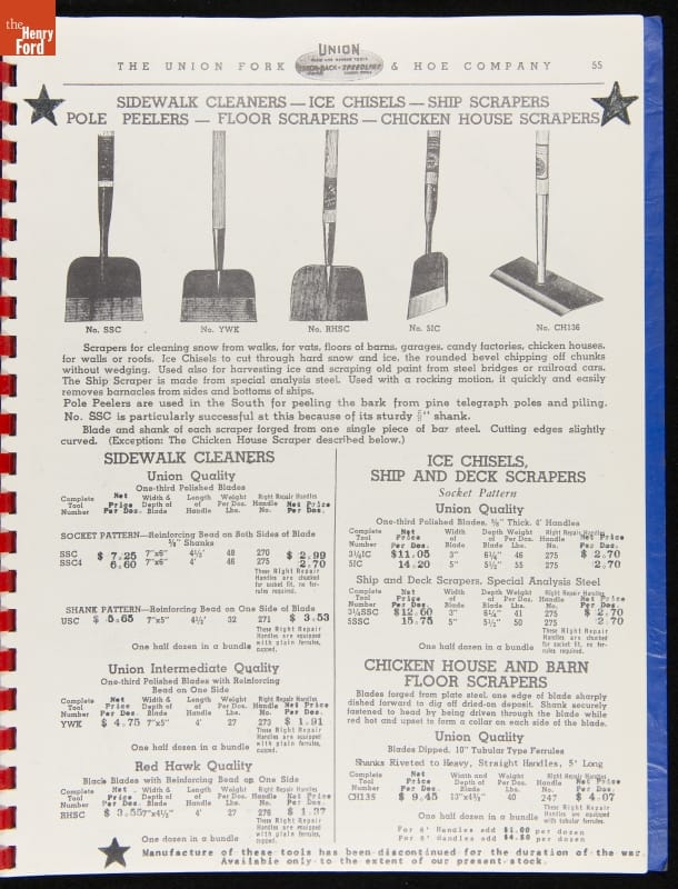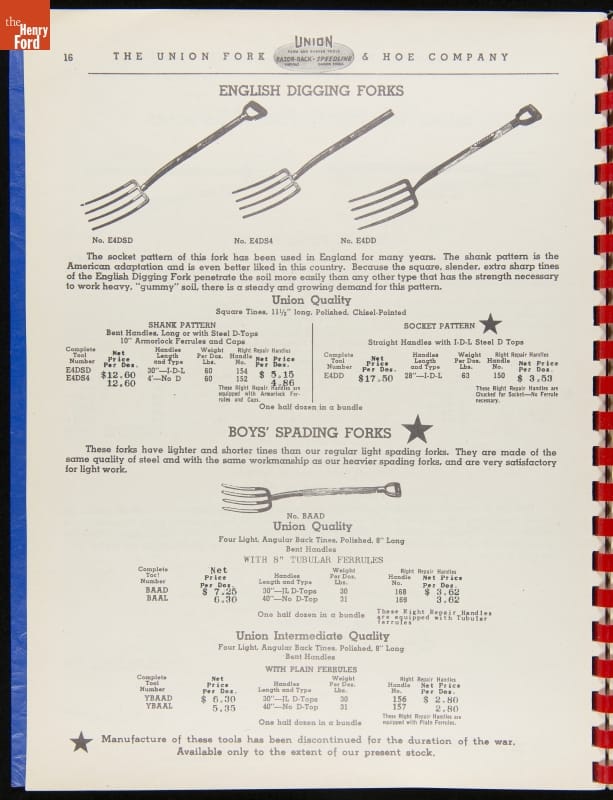 Union Fork & Hoe Company Catalog and Price List No. 142, August 1, 1942