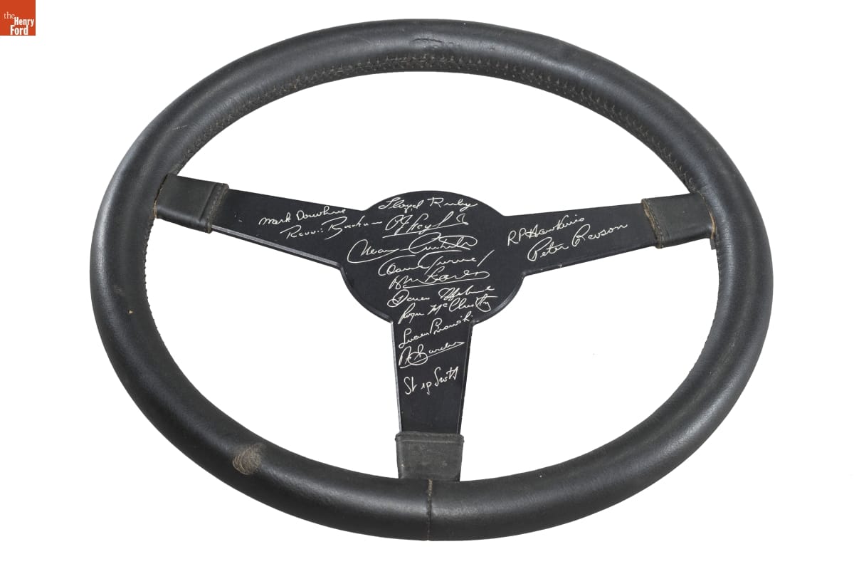 This steering wheel includes facsimile signatures from Ford drivers who raced at the 24 Hours of Le Mans in 1967. The names include Mark Donohue, Ronnie Bucknum, Lloyd Ruby, A.J. Foyt, Mario Andretti, Dan Gurney, Bruce McLaren, Denny Hulme, Roger McCluskey, Lucien Bianchi, Frank Gardner, Skip Scott, Paul Hawkins, and Peter Revson.