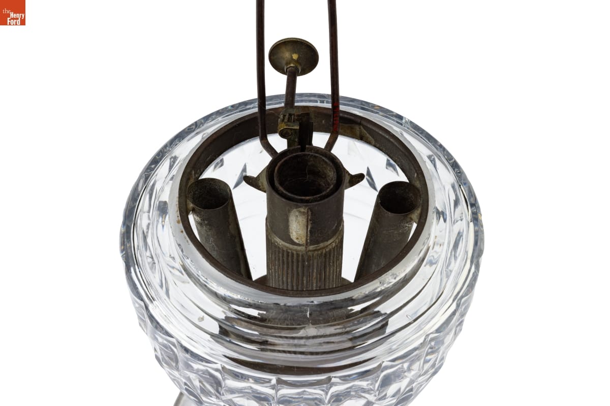 Traditional make-dos are useful and precious objects that broke during their working lives. Their owners felt compelled to restore or repurpose these objects in a variety of ways. This lamp started out as an expensive cut glass sugar bowl, but the base now serves as a reservoir for lamp fuel.