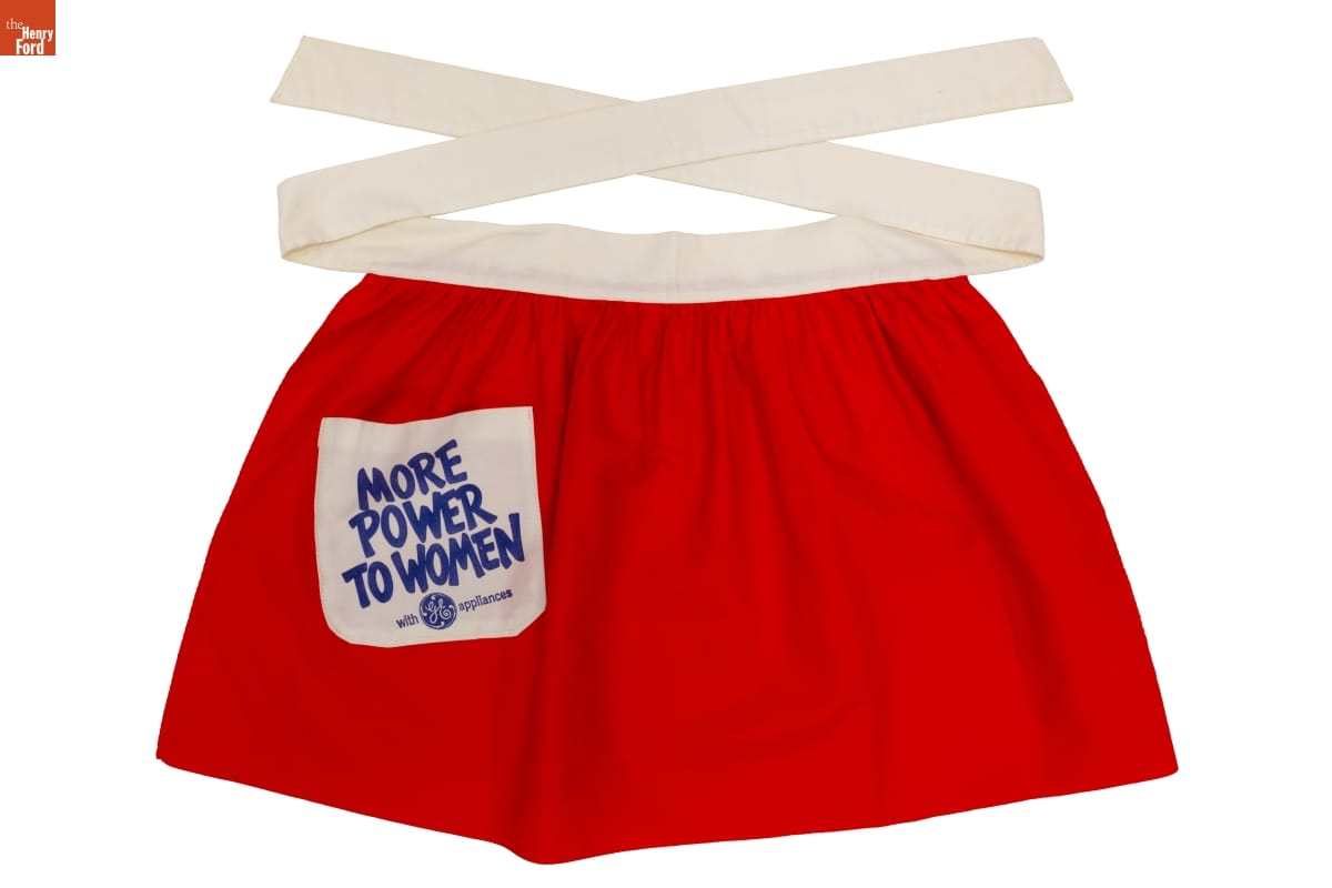 The slogan on the pocket of this apron advertising the General Electric Company, "More Power to Women!" alludes to the company's electrical appliances and the Women's Movement of the 1970s. The irony? The slogan is about empowerment, but it appears on a garment usually used by a housewife -- a traditional woman's role often seen as "unempowered."
