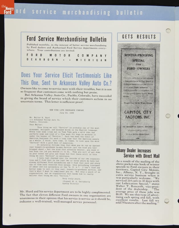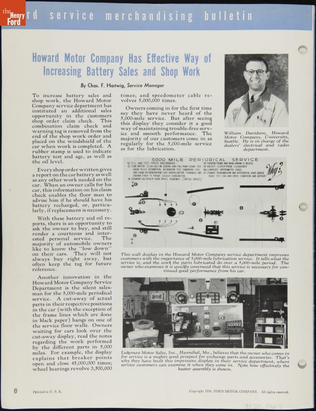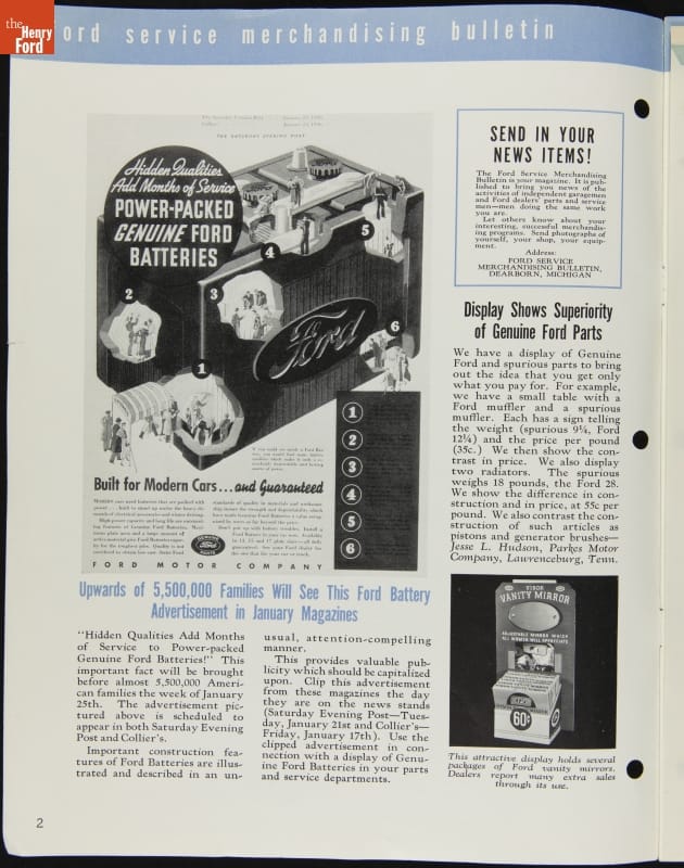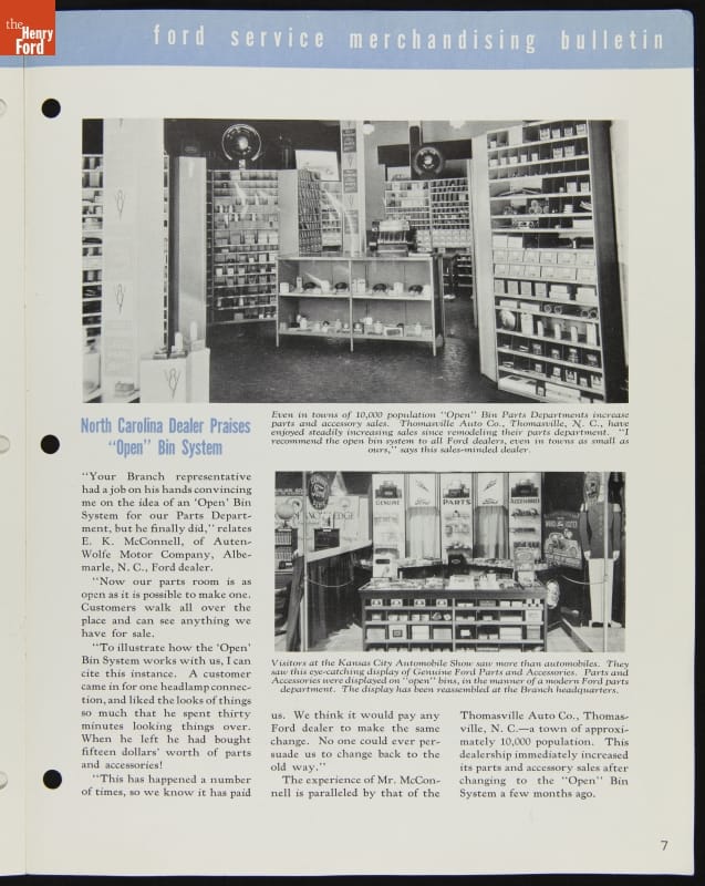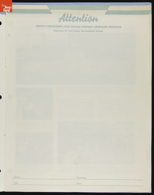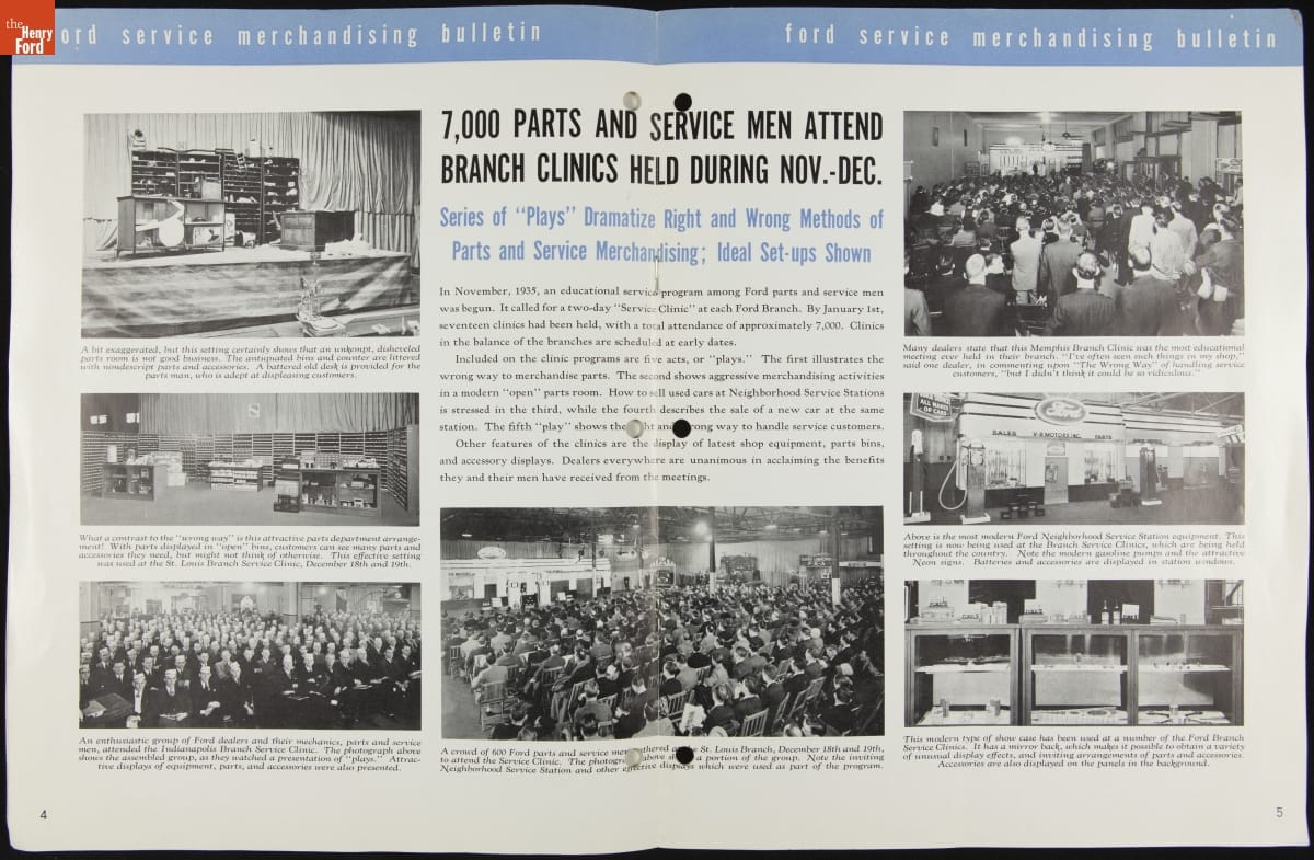 Ford Motor Company published regular merchandising bulletins to ensure consistent branding, marketing and service throughout its dealer network. Each bulletin provided guidance on topics like showroom displays, sales techniques and strategies, and updates to Ford, Mercury and Lincoln vehicles and accessories. General sales figures were often published, as were profiles of successful dealerships.