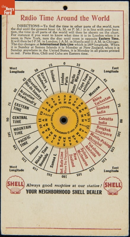 Gas station operators and mechanics advertised their services with promotional giveaways. This circa 1929 chart capitalized on the growing popularity of amateur or ham radio. By adjusting the wheel accordingly, a radio operator could determine the current time anywhere in the world. Broadcast AM radios were just making their way into cars at the time too.