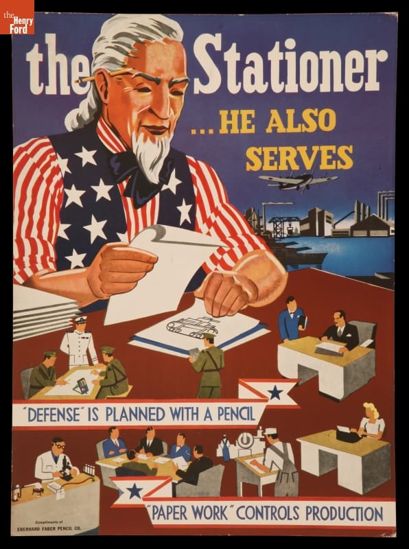 During the Second World War, government organizations and private companies alike produced posters that aimed to influence consumers on the home front by appealing to patriotic sentiment. Eberhard Faber, America's oldest pencil manufacturing company, produced this example that depicted the stationery business' important contributions to the war effort.