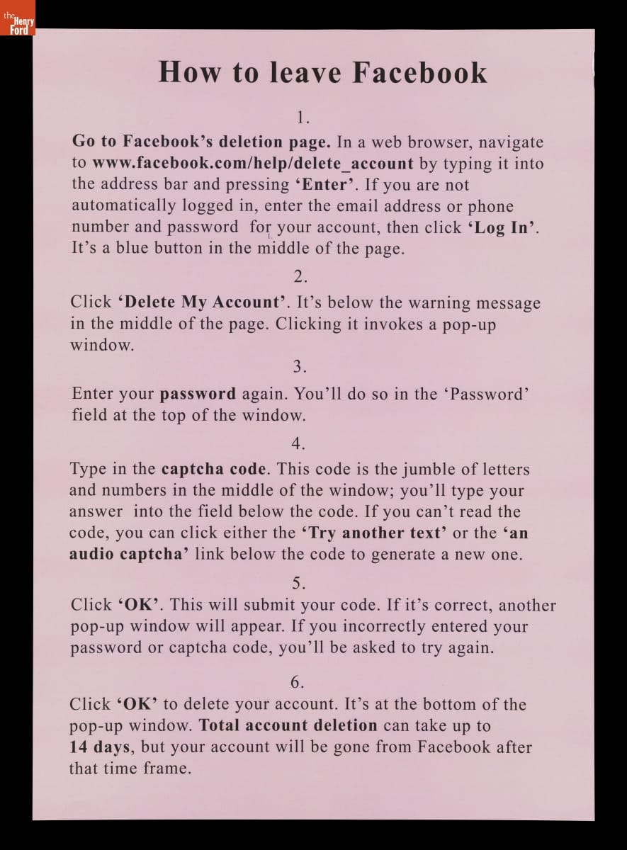Jeremy Deller's poster provides instructions on how to delete a Facebook account--a reaction stemming from the Cambridge Analytica privacy breach scandal. Wariness toward social media was growing due to its pervasiveness, privacy issues, targeted advertising, and people's desire to increase non-digital social interaction. The "Millennial Pink" background references the generation most associated with the rise of social media platforms.