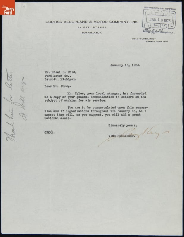 Letter Congratulating Edsel Ford for Involving Ford Dealers with Airmarking Buildings in Their Towns, January 15, 1926