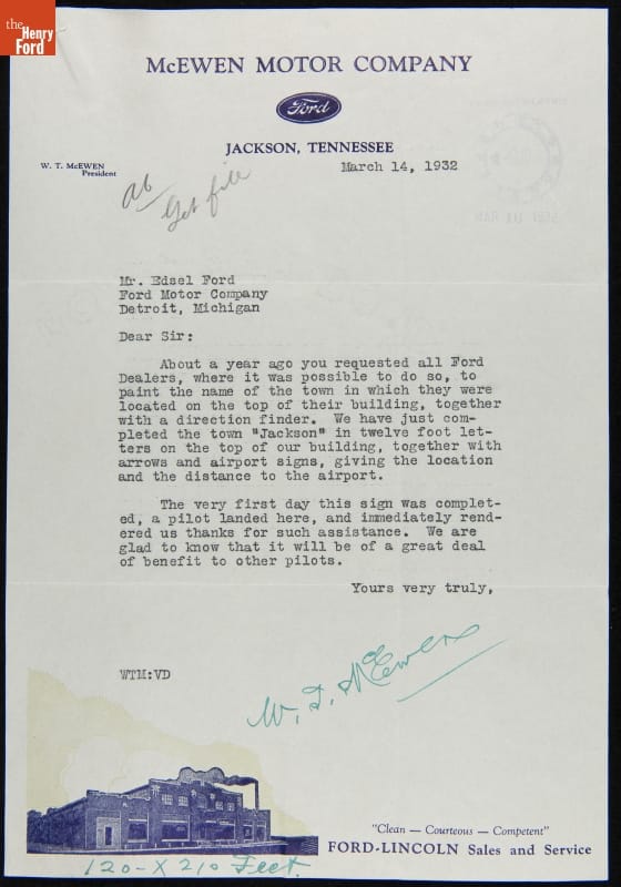 Letter from a Ford Dealer Informing Edsel Ford Their Building's Airmarker is Being Used by Pilots, March 1932