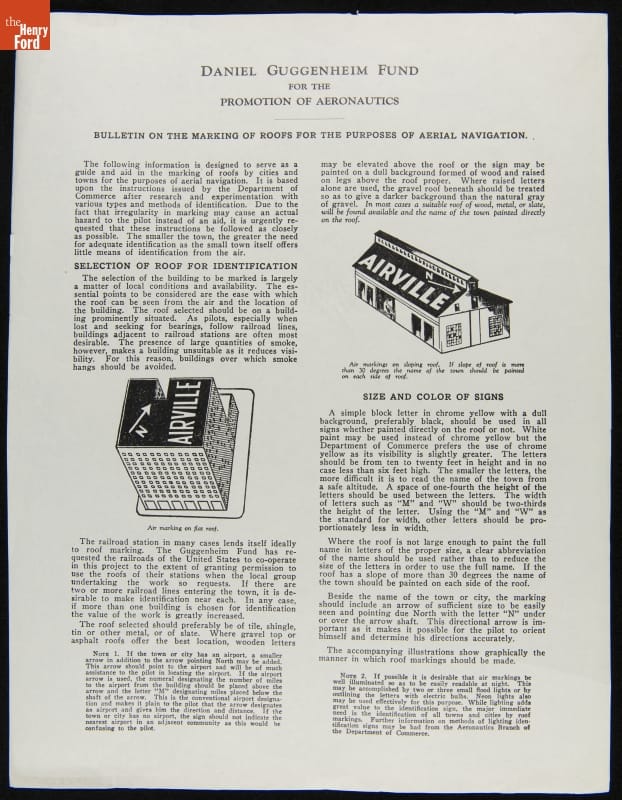 Philanthropist Daniel Guggenheim established a Fund for the Promotion of Aeronautics in 1926. The fund supported a town identification project encouraging every American community to paint its name and a north-pointing arrow on the roof of a prominent building. Recommended letter height was 12 feet -- to be plainly visible from airplanes 3,000 feet in the sky.