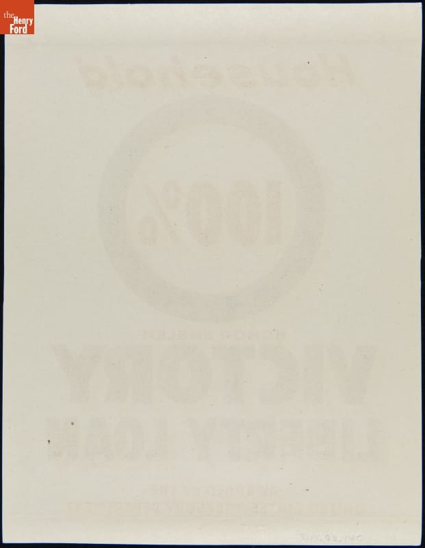 During World War I, the United States government issued bonds to help finance the war effort. American citizens, businesses, and especially financial institutions purchased bonds, raising more than 17 billion dollars. Donors to the Liberty and Victory Loan bond drives could adhere signs, like this one, to their windows to let everyone know they were doing their part.