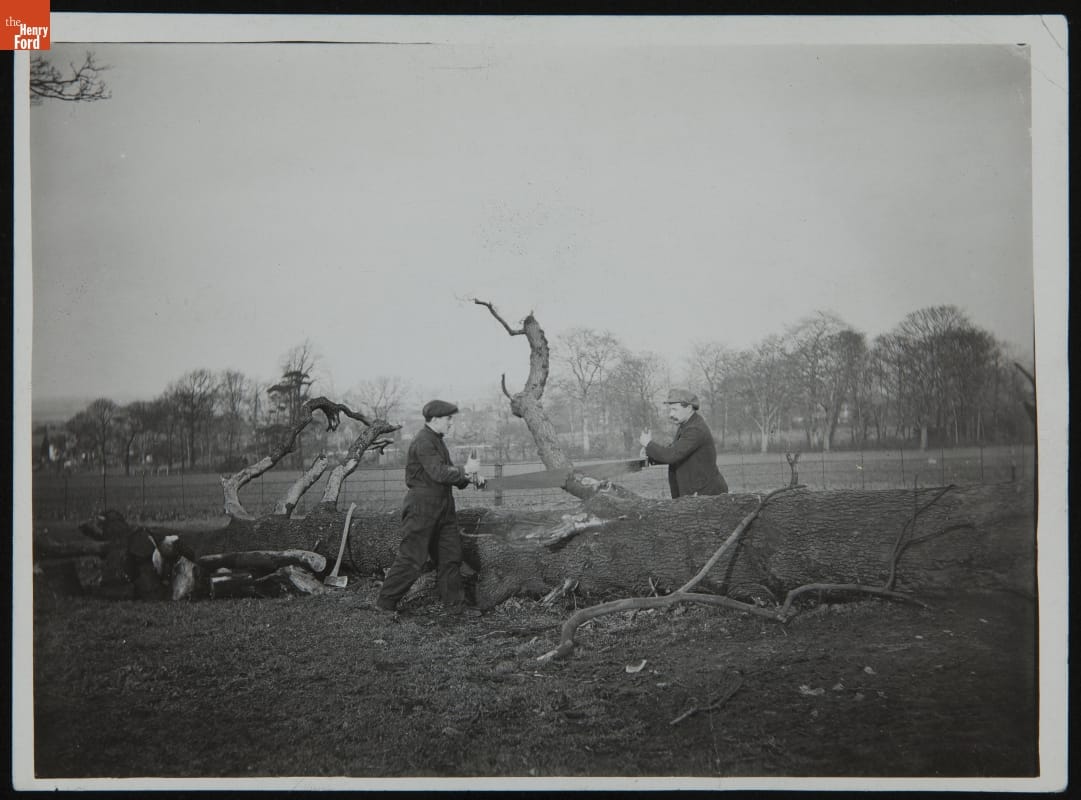 Belgians Sawing a Fallen Tree in the Grounds of Oughtrington Hall for Firewood, circa 1915