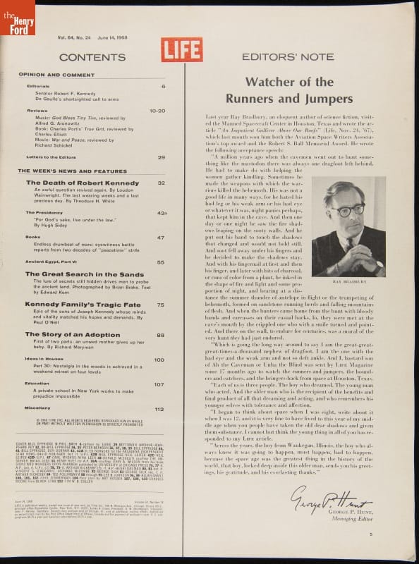 In early June 1968, Democratic Presidential candidate Robert "Bobby" Kennedy was shot and mortally wounded after winning the California primary. Many Americans had pinned their hopes on the brother of assassinated President John Kennedy to restore faith in a country seemingly slipping into social and political turmoil. After the tragic event, newspapers and magazines produced memorial issues documenting the life of the slain leader.