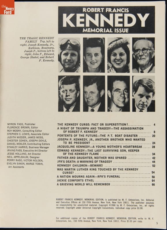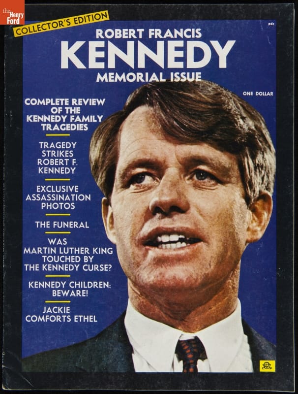 In early June 1968, Democratic Presidential candidate Robert "Bobby" Kennedy was shot and mortally wounded after winning the California primary. Many Americans had pinned their hopes on the brother of assassinated President John Kennedy to restore faith in a country seemingly slipping into social and political turmoil. After the tragic event, newspapers and magazines produced memorial issues documenting the life of the slain leader.