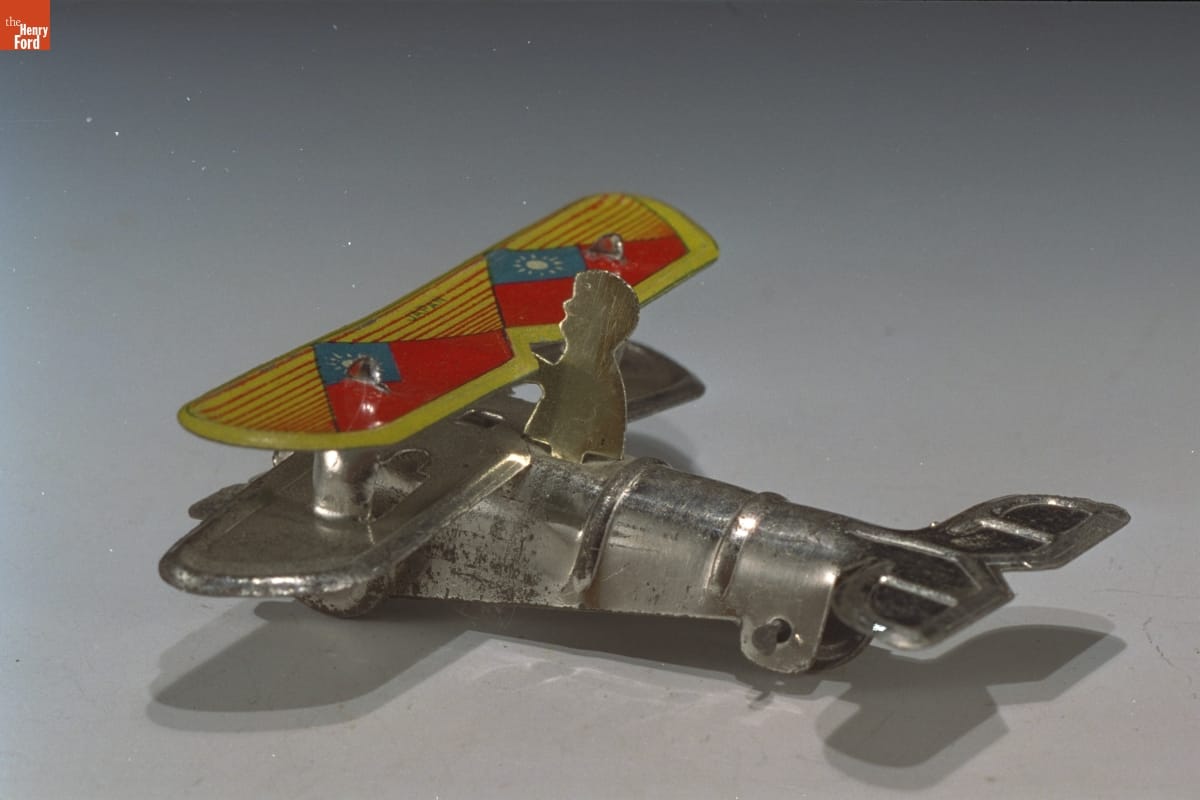 Toy companies began making small, inexpensive, yet colorful, tin toys in the late 19th century. Over the years, toymakers stamped tin into shapes of animals, trains, boats, soldiers and even this airplane. Children could purchase these low-priced toys from shopkeepers or street vendors. These mass-produced toys -- though not meant to last -- provided fun for just a few pennies.