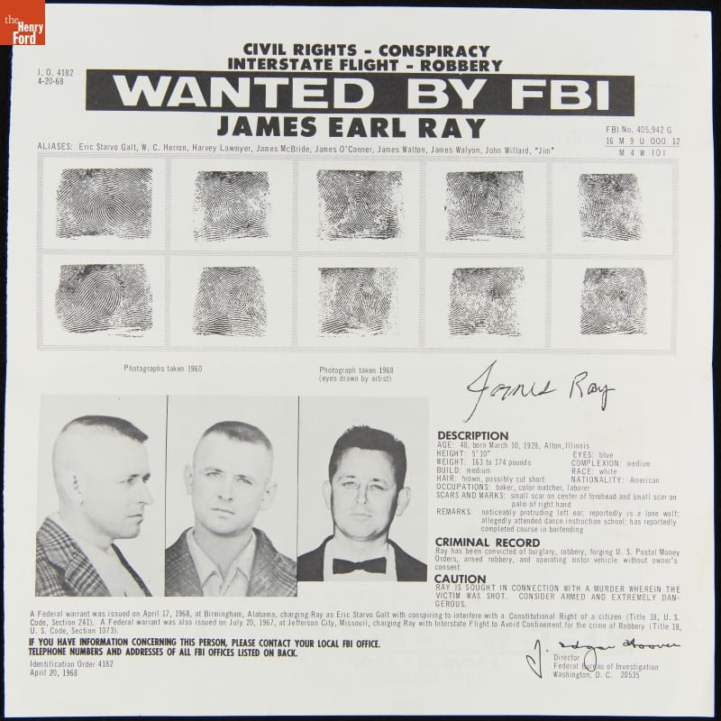 A nationwide manhunt began after Dr. Martin Luther King, Jr. was fatally shot on April 4, 1968. The FBI identified James Earl Ray as the assassin and issued posters to its national branches and other law enforcement agencies. On June 8, 1968, British police apprehended Ray at a London airport as he tried to flee to Rhodesia.